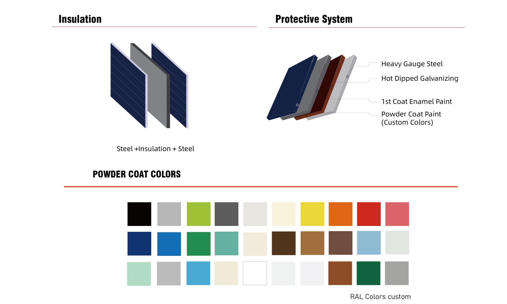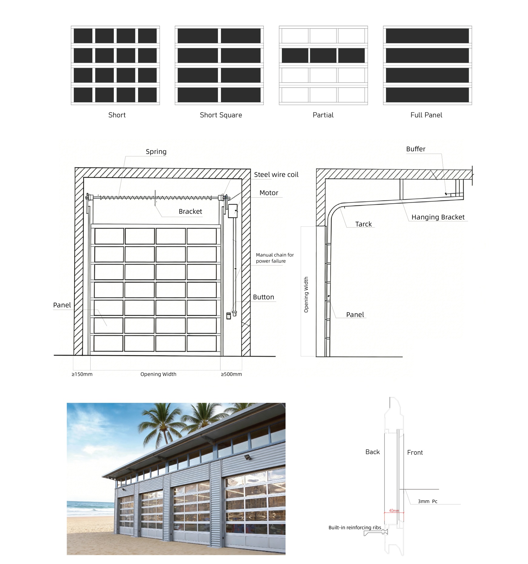 Изготовлен из высококачественного алюминиевого сплава 6063-T6 в сочетании с панелями из закаленного стекла, предлагающими четыре варианта тонированного стекла. Имеет слой полиуретановой изоляции на задней панели для улучшения тепловых характеристик. Отличается элегантным, неподвластным времени дизайном, простотой установки и обслуживания. Использует сегментированный механизм выдвижения вверх, что позволяет максимально эффективно использовать пространство гаража.