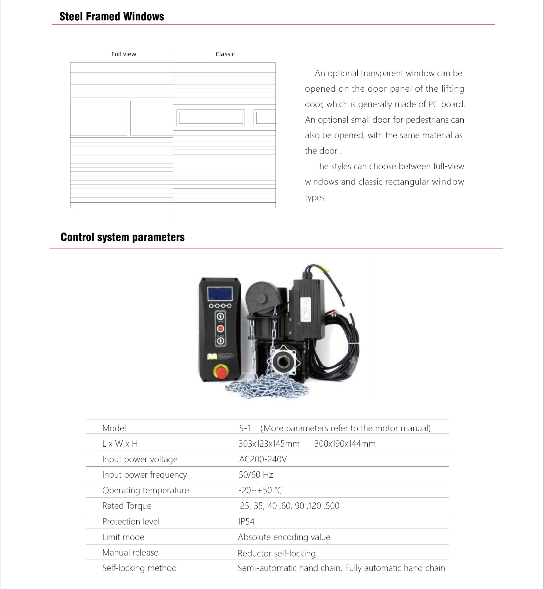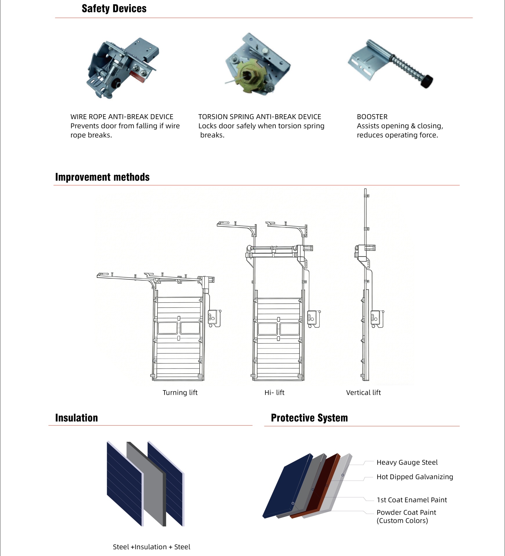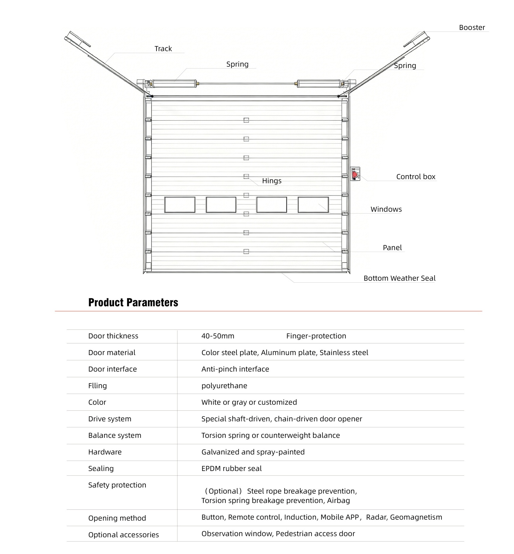 Изготовлен из прочных, не требующих особого ухода двухсторонних стальных панелей, заполненных пенополиуретаном, что обеспечивает легкий вес, но высокую прочность. Секции поднимаются вертикально вверх или устанавливаются на крыше здания для удобства монтажа и обслуживания. Обладает высокой устойчивостью к ветру и давлению, подходит для коммерческих помещений, таких как заводские мастерские и склады для хранения товаров. Адаптируется к различным климатическим условиям Европы, Америки и Центральной Азии, включая засушливые и песчаные регионы, и выдерживает экстремальные погодные условия, такие как тайфуны и снежные бури.